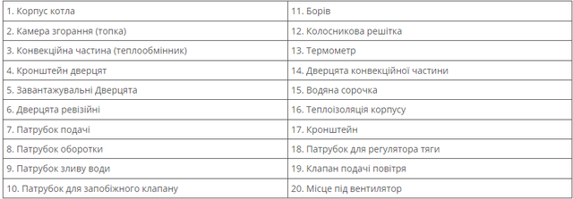 | Види твердого палива | Дрова, Тріска, Тирса, Пелети, Брикети, Кора, Кам'яне вугілля, Буре вугілля, Антрацит, Стружка |