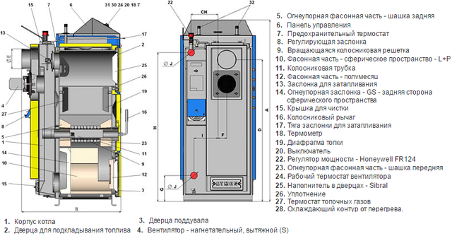 продуктів згоряння та газів. Простір згоряння, що знаходиться під насипною частиною, викладено керамічними блоками. У задній частині корпусу котлів розташований вертикальний канал для продуктів згоряння, оснащений у верхній частині клапаном для розтоплення. У верхній частині каналу продуктів згоряння знаходиться патрубок для приєднання до димоходу.